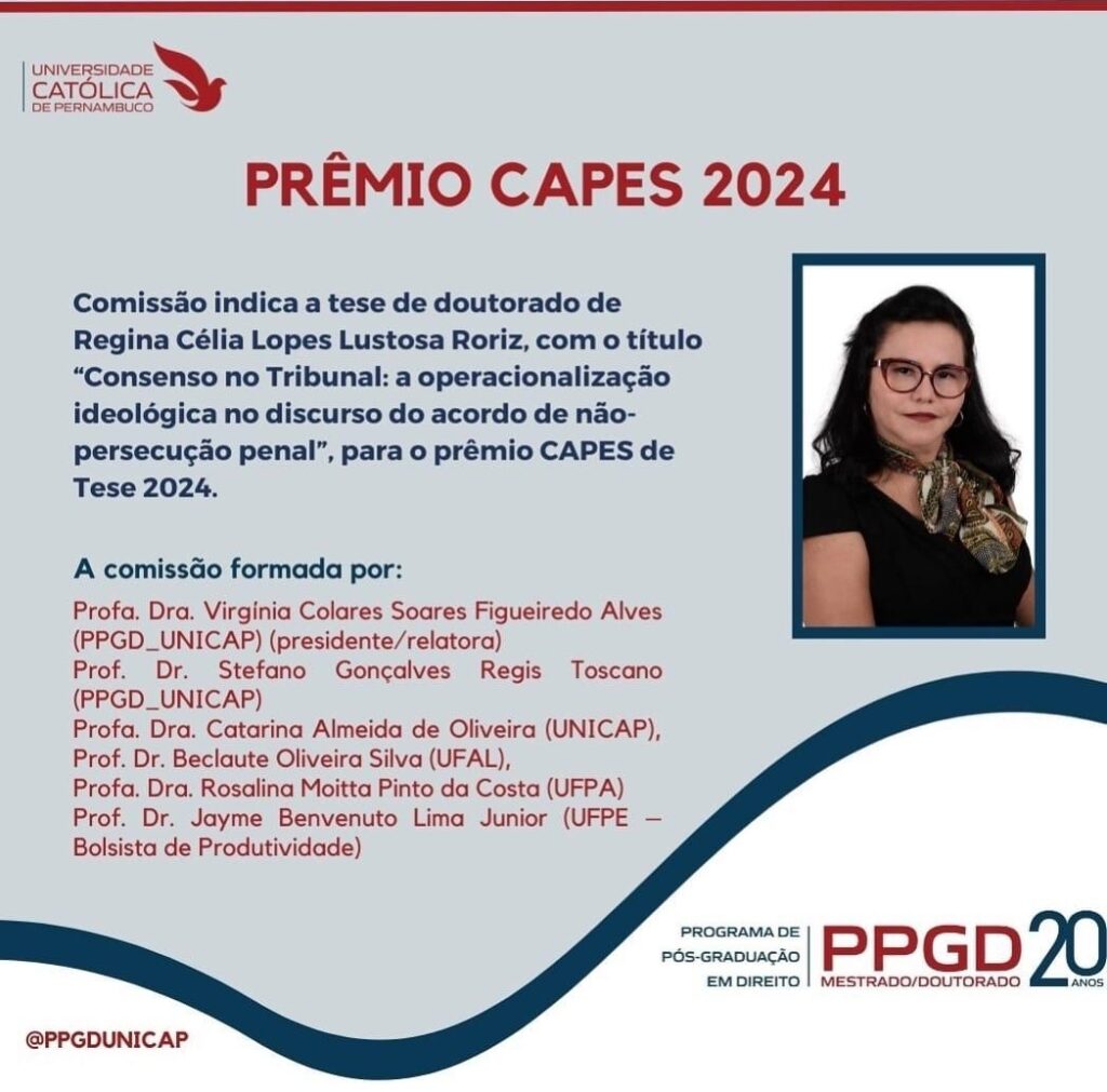 A Professora Dra Regina Célia Lopes Lustosa Roriz teve tese eleita pela Universidade Católica de Pernambuco- Unicap como a melhor do ano de 2023 e é indicada para disputar prêmio nacional em 2024.