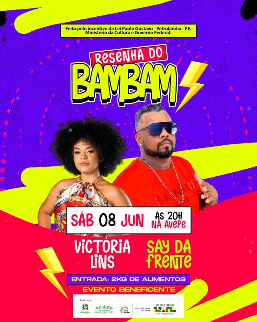 No dia 8 de junho, a partir das 20h, acontece o evento “Resenha do Bambam” na AVEPE em Petrolândia, PE. Este evento beneficente contará com as atrações musicais Victória Lins e Say da Frente, prometendo uma noite de muita música e solidariedade.