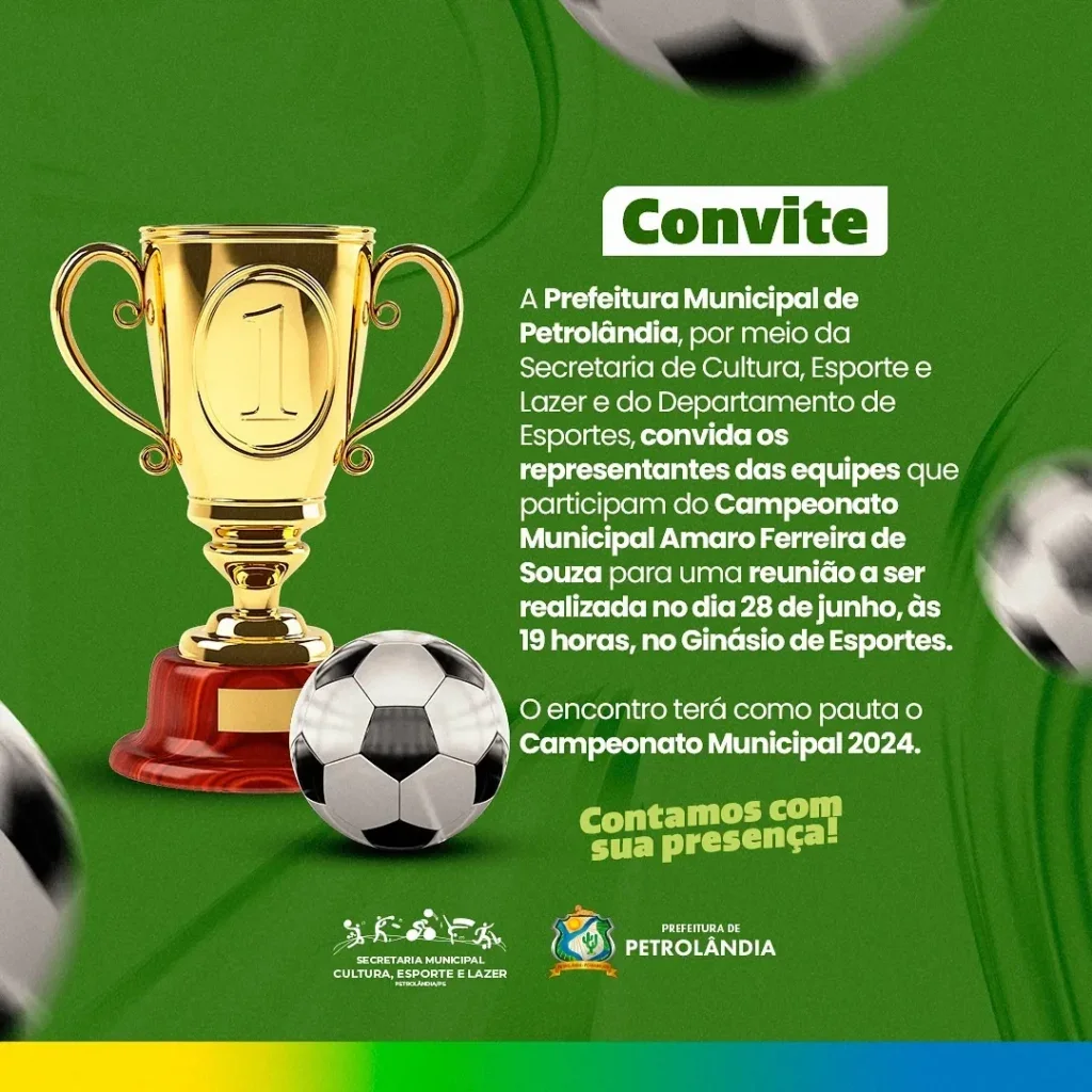 A Prefeitura Municipal de Petrolândia, por meio da Secretaria de Cultura, Esporte e Lazer e do Departamento de Esportes, convida todos os representantes das equipes que participam do Campeonato Municipal Amaro Ferreira de Souza para uma importante reunião. O encontro será realizado no dia 28 de junho, às 19 horas, no Ginásio de Esportes.