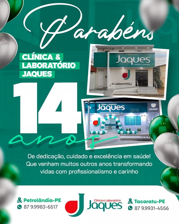 Com uma trajetória marcada pelo compromisso, ética e cuidado com os pacientes, a Clínica e Laboratório Jaques celebra, neste mês, 14 anos de serviços prestados à população de Petrolândia e região.
