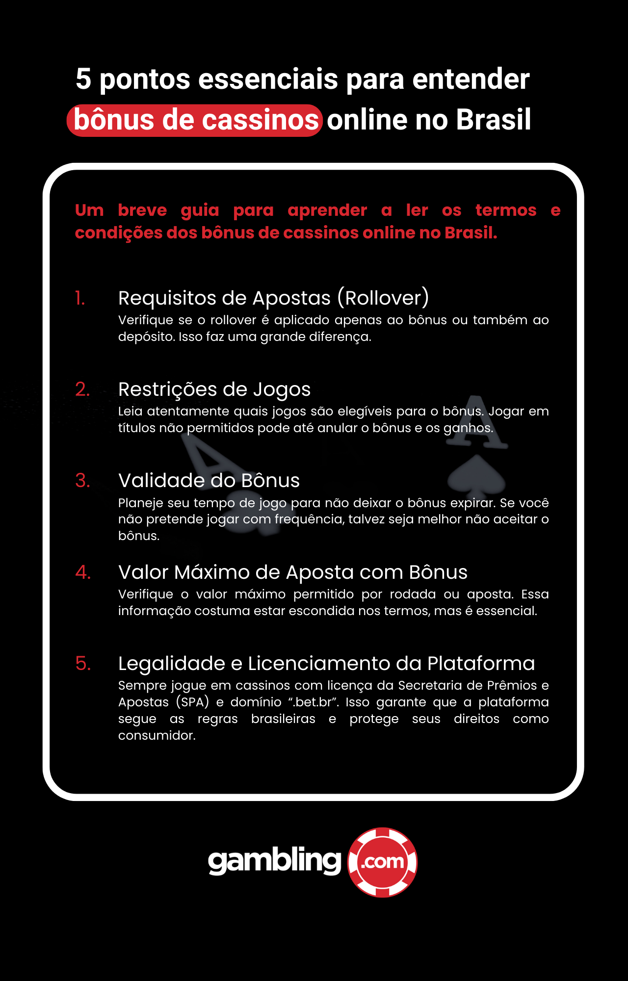 O guia preparado pela Gambling, principal autoridade independente em jogos online no Brasil, permite que você aprenda a ler os termos e condições dos bônus de cassinos online no Brasil. Confira requisitos de aposta, restrições de jogos, validade do bônus, limite de aposta e licenciamento para evitar surpresas nos cassinos online legais do Brasil.