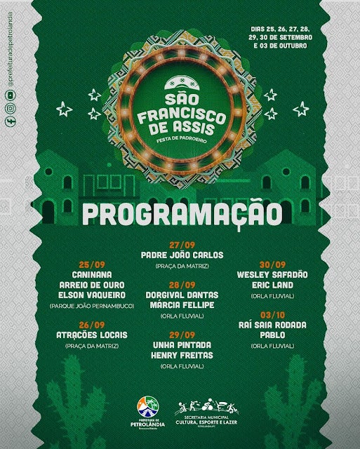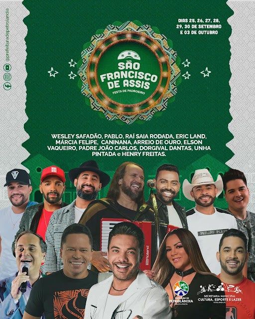 A espera acabou! O prefeito Fabiano Marques ao lado do Vice-Prefeito Rogério Novaes e da Secretaria de Cultura, Esporte e Lazer de Petrolândia, anunciaram na noite desta segunda-feira (15) a grade de atrações musicais da Festa de Padroeiro São Francisco de Assis 2022 e da Missa do Vaqueiro.