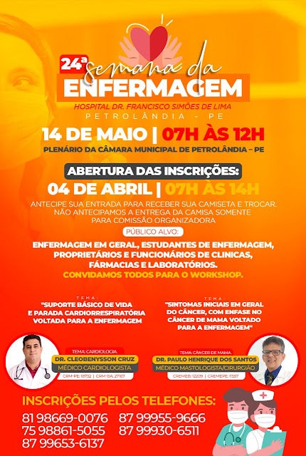 O enfermeiro João Vicente informa que nesta próxima segunda-feira (4) das 7h às 14h as inscrições da 24ª Semana da Enfermagem do Hospital Dr. Francisco Simões de Lima de Petrolândia.