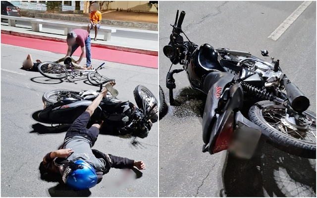 O condutor da moto estava consciente orientado com hemorragia no nariz, já o ciclista estava em pé se apresentava muito nervoso se queixando de dores fortes nas pernas, além de hematomas no olho esquerdo e no nariz. A guarnição prontamente realizou os trabalhos de imobilização, tratamento dos ferimentos e transporte de ambos para o Hospital Municipal da cidade.