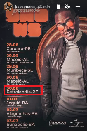 Os cantor baiano Leó Santana ‘O Gigante’ vai substituir Wesley Safadão no show em comemoração ao aniversário de 113 anos de Petrolândia-PE, a ser realizado nesta próxima quinta-feira (30), após o artista cancelar a agenda de shows até o dia 6 de julho. Safadão se internou novamente nesta quarta-feira (29) devido à problemas de saúde. (leia mais aqui).