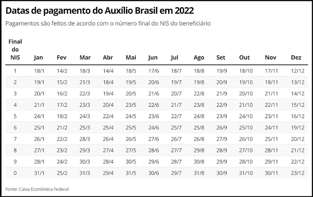 O Auxílio Brasil manteve as datas de depósitos do Bolsa Família, que funcionam de acordo com o fim do NIS. Veja o calendário abaixo: