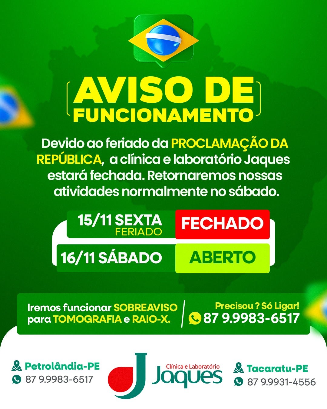Informamos que, devido ao feriado da Proclamação da República, a Clínica e Laboratório Jaques estará fechada nesta sexta-feira, dia 15/11. Retornaremos ao funcionamento normal no sábado, 16/11.