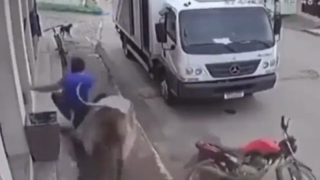 A situação aconteceu por volta das 9h40 da manhã, do último sábado. Pelas imagens é possível ver que o animal veio da via principal quando chega a calçada e atinge uma motocicleta que estava estacionada, antes de atropelar o homem e fugir. Uma segunda pessoa aparece depois para ajudar o homem. Veja: