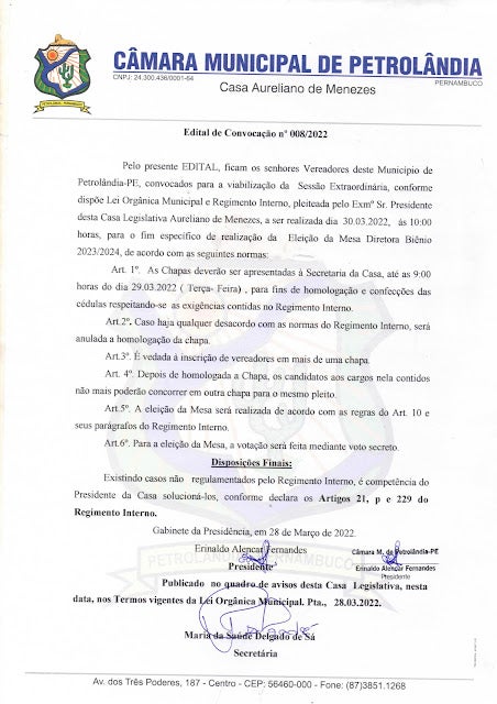 A Câmara Municipal de Petrolândia antecipou a eleição da Mesa Diretora para o biênio 2023/2024. E deverá ocorrer em sessão extraordinária na manhã desta quarta-feira (30), a partir das 10h00min. A Câmara de Petrolândia é composta por 11 Vereadores que deverão escolher o próximo presidente.