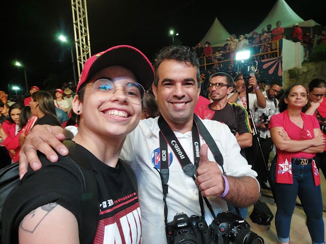 Léo Lins e o Blogueiro/Repórter Alex Santos durante ato/Foto: Divulgação