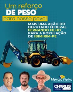 O Vereador Mércio Vieira de Ibimirim-PE expressou sua satisfação e gratidão pela vinda de uma retroescavadeira, fruto de uma emenda parlamentar do Deputado Federal Fernando Filho. Essa aquisição representa um reforço significativo para os esforços em prol do desenvolvimento e da qualidade de vida dos ibimirienses.