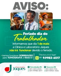 A Clínica e Laboratório Jaques comunica que estará fechada no dia 1º de maio em virtude do feriado do Dia do Trabalhador. No entanto, estará disponível para atendimentos de tomografia e raio-x sob regime de sobreaviso.