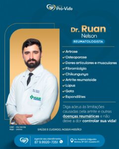Descubra como alcançar uma vida sem limitações com o renomado Dr. Ruan Nelson na Clínica Pró-Vida! Especializado em reumatologia, o Dr. Ruan está pronto para oferecer o cuidado especializado que você merece, capacitando-o a superar os obstáculos impostos por condições como artrose, osteoporose, dores articulares e musculares, fibromialgia, chikungunya, artrite reumatoide, lúpus, gota, espondilites e outras doenças reumáticas.