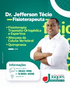 A Clínica JAQUES, localizada em Tacaratu, PE, passa a contar com a habilidade e experiência do Dr. Jefferson Técio, renomado fisioterapeuta especializado em Fisioterapia Traumato-Ortopédica e Esportiva, além de tratamentos para Afecções da Coluna Vertebral e Quiropraxia.