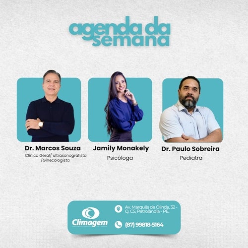 A Climagem de Petrolândia-PE, divulgou sua agenda semanal com três importantes atendimentos voltados ao cuidado da população, reunindo profissionais reconhecidos nas áreas de clínica geral, ginecologia, ultrassonografia, obstetrícia, psicologia e pediatria.