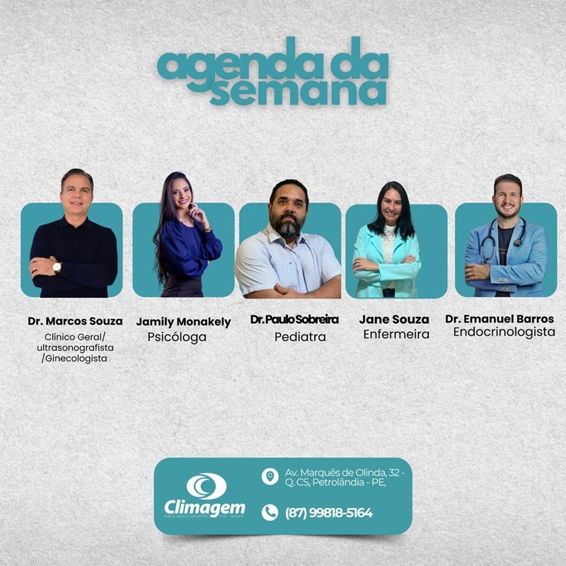A Climagem – Clínica Médica e Diagnóstico por Imagem divulgou sua Agenda da Semana, com atendimento de profissionais de diversas especialidades, reforçando o compromisso com a saúde e o cuidado integral da população de Petrolândia.