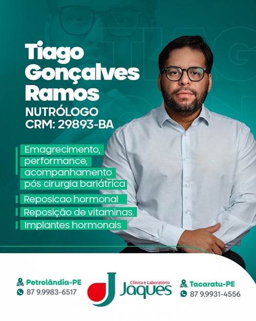 A Clínica Jaques, referência em saúde nas cidades de Tacaratu e Petrolândia, traz uma novidade especial para seus pacientes: no próximo dia 24 de abril, as unidades contarão com atendimento do Dr. Tiago Gonçalves, médico nutrólogo, especializado em promover saúde, bem-estar e qualidade de vida.