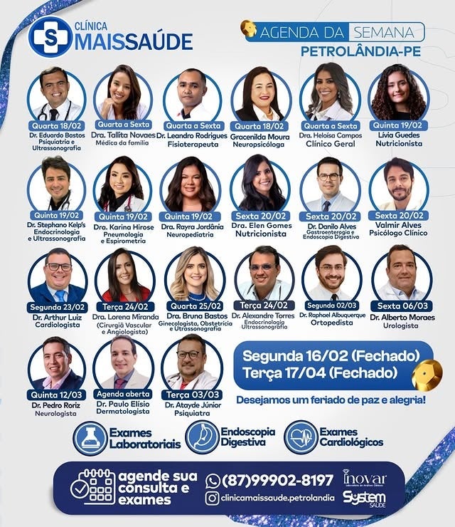 A Clínica Mais Saúde divulgou a agenda de atendimentos da semana em Petrolândia, com consultas em diversas especialidades médicas e realização de exames.