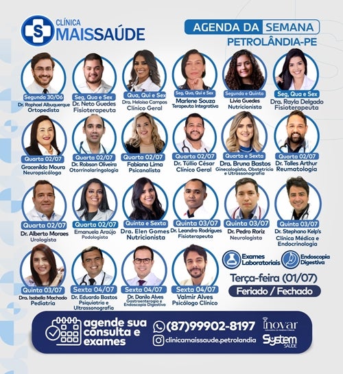 A Clínica Mais Saúde, referência em atendimento de qualidade no Sertão de Pernambuco, divulgou a agenda completa de especialistas para esta semana em Petrolândia-PE. Com uma equipe multidisciplinar altamente qualificada, a clínica oferece consultas, exames e procedimentos com conforto, eficiência e cuidado humanizado.