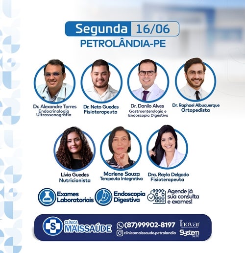 A Clínica Mais Saúde, referência em atendimento médico especializado em Petrolândia-PE, divulga sua agenda de atendimentos para esta segunda-feira, 16 de junho.