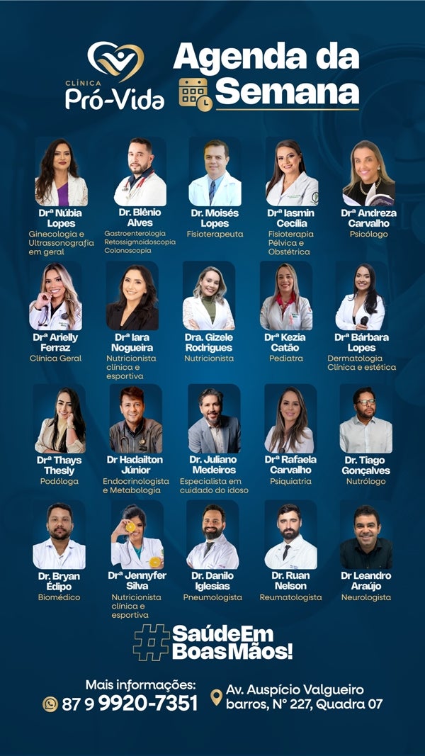 A Clínica Mais Saúde, localizada na Avenida Auspício Valgueiro Barros, nº 227 – Quadra 07, em Petrolândia (PE), divulgou sua agenda médica da semana, com atendimentos em várias especialidades para melhor atender a população.