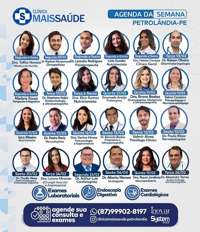 A Clínica Mais Saúde, em Petrolândia-PE, divulgou sua Agenda da Semana, com uma programação completa de atendimentos médicos e multiprofissionais, reunindo especialistas em diversas áreas da saúde para melhor atender a população do município e região.
