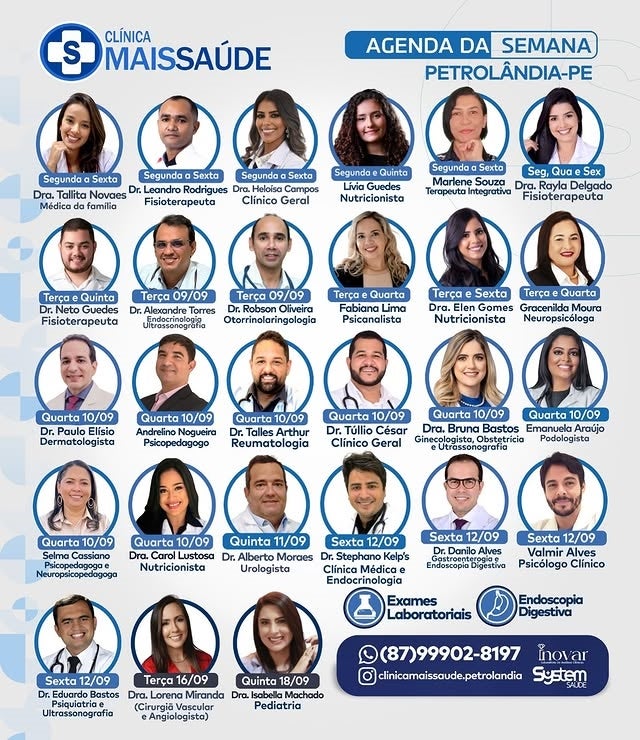 A Clínica Mais Saúde de Petrolândia-PE divulgou a programação de atendimentos para esta semana, contando com diversos especialistas à disposição da população.