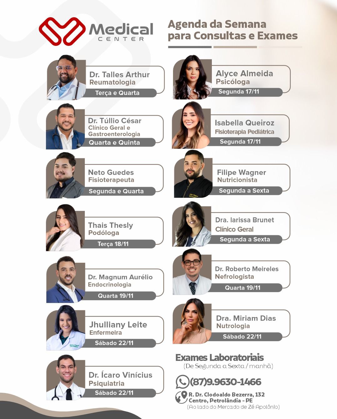 A Clínica Medical Center divulgou sua agenda semanal com atendimentos em diversas especialidades, além da realização de exames laboratoriais de segunda a sexta. Os profissionais estarão disponíveis ao longo da semana oferecendo serviços médicos e terapêuticos em Petrolândia-PE. Confira a programação completa: