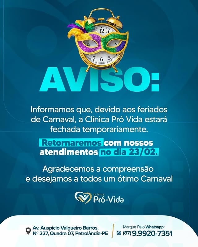 A Clínica Pró-Vida de Petrolândia comunicou que estará temporariamente fechada devido aos feriados de Carnaval. De acordo com o aviso divulgado, os atendimentos serão retomados no próximo dia 23 de fevereiro.