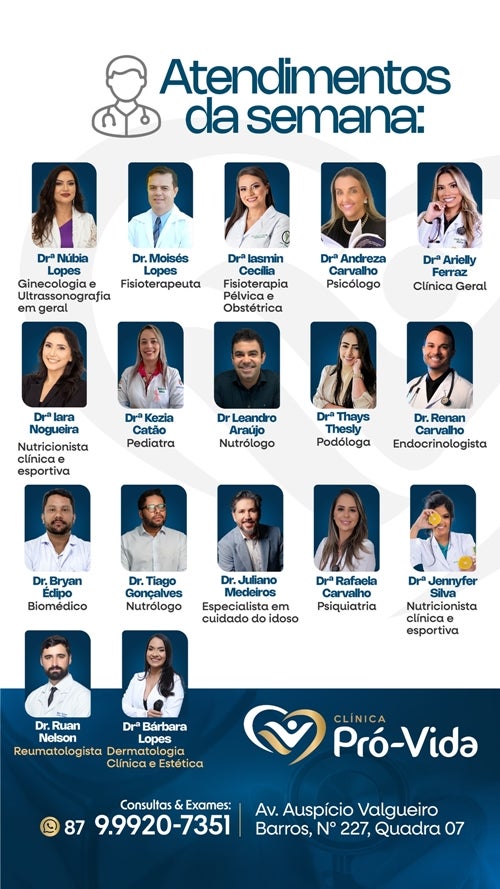 A Clínica Pró-Vida, referência em saúde e bem-estar em Petrolândia-PE, divulga a agenda de atendimentos dos especialistas desta semana. São mais de 15 profissionais qualificados em diversas áreas da medicina, prontos para cuidar de você e da sua família com atenção, responsabilidade e acolhimento.