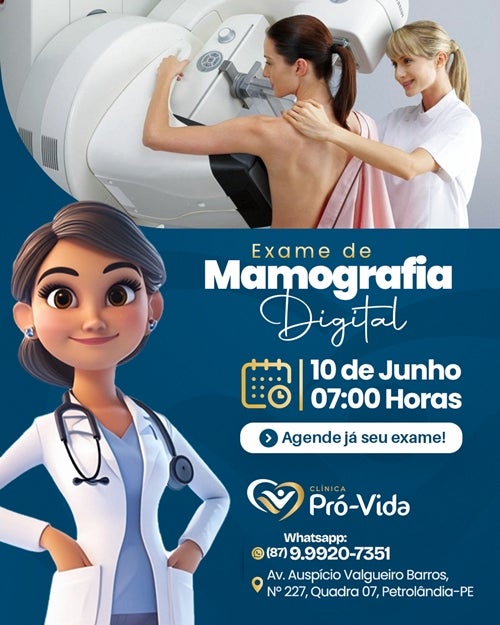 A Clínica Pró-Vida realizará exames de Mamografia Digital no próximo dia 10 de junho, a partir das 07h da manhã.
