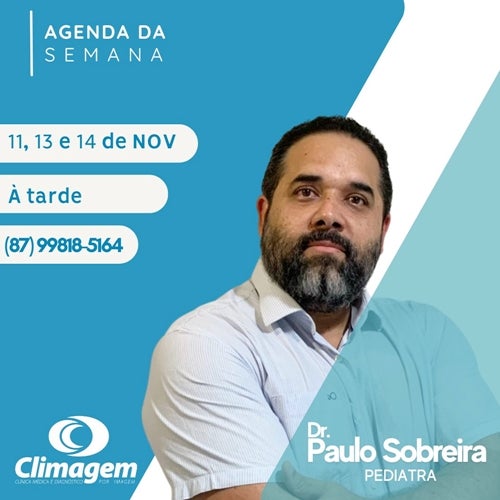 Sabemos o quão importante é garantir o melhor para a saúde dos nossos filhos. E para proporcionar o atendimento de excelência que eles merecem, o renomado médico pediatra Dr. Paulo Sobreira estará disponível para consultas na CLIMAGEM em Petrolândia, nesta terça-feira (11), nesta quinta-feira (13) e na próxima Sexta (14), no período da tarde.