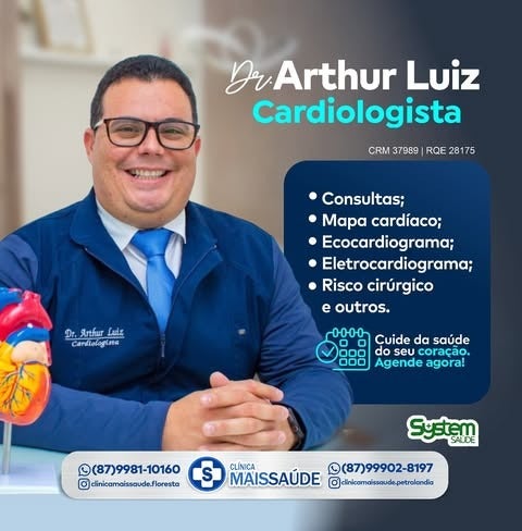 Atenção, Petrolândia e região! Nesta sexta-feira, 25 de julho, a Clínica Mais Saúde recebe o renomado Dr. Arthur Luís, médico cardiologista, para atendimentos especializados.
