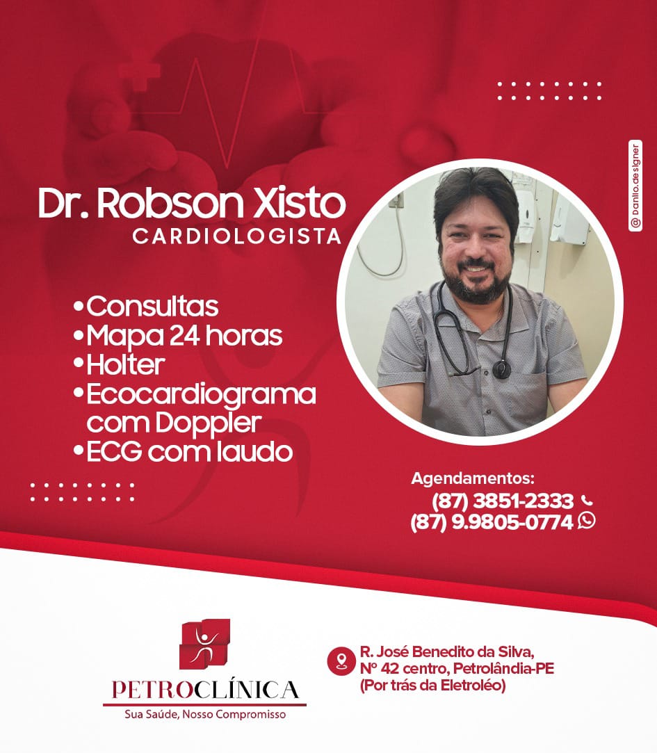 Dr Robson Xisto, médico Cardiologista estará atendendo na Petroclínica de Petrolândia, no dia (28) ‘quinta-feira’. Realizando Mapa 24hrs, Holter, Eletrocardiograma e Ecocardiograma com Doppler