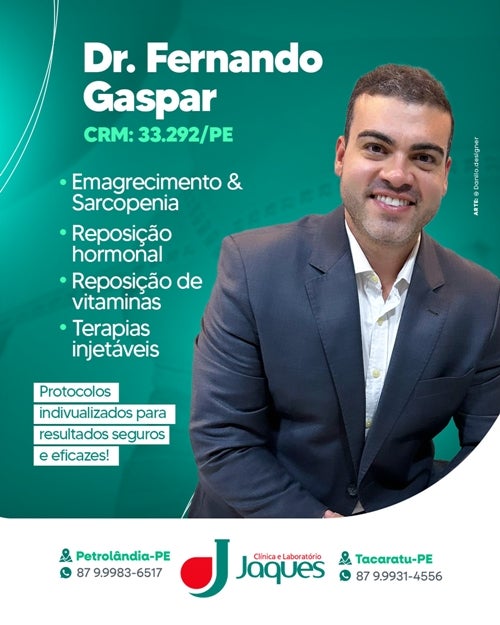 O médico Dr. Fernando Gaspar (CRM 33.292/PE), especialista em emagrecimento e sarcopenia, estará atendendo nesta segunda-feira, 1º de setembro, na Clínica Jaques, em Petrolândia-PE.