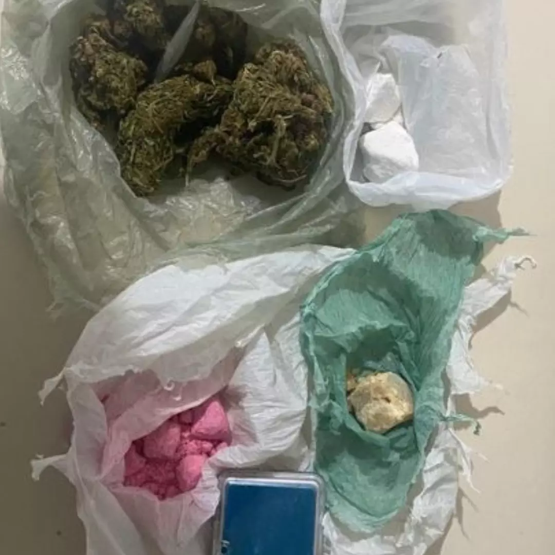 Diante dessas informações, as equipes policiais, incluindo a GGI-4050, GATI, NIS 2 e Malhas da Lei, se dirigiram ao local. Com a autorização da proprietária da residência vizinha, a bolsa foi encontrada e, ao ser vistoriada, foram localizadas as seguintes substâncias entorpecentes: 24g de crack, 36g de cocaína, 47g de cocaína rosa, 41g de maconha e uma balança de precisão.