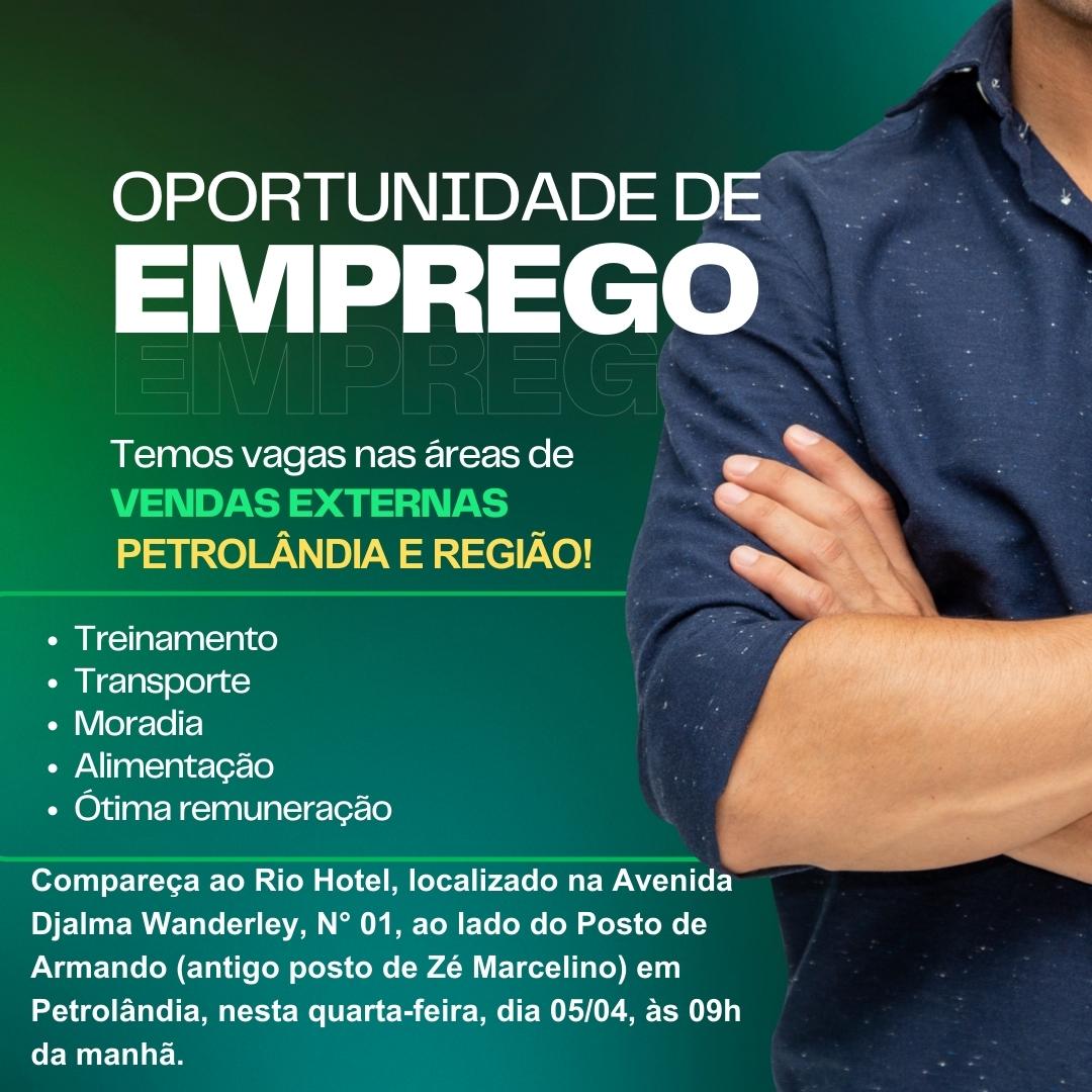 Atenção, atenção! Uma ótima oportunidade de emprego acaba de surgir para os solteiros maiores de 18 anos que residem em Petrolândia e região e têm disponibilidade para viagem imediata. Estamos comunicando vagas de emprego para vendas externas de um produto de fácil aceitação no mercado.