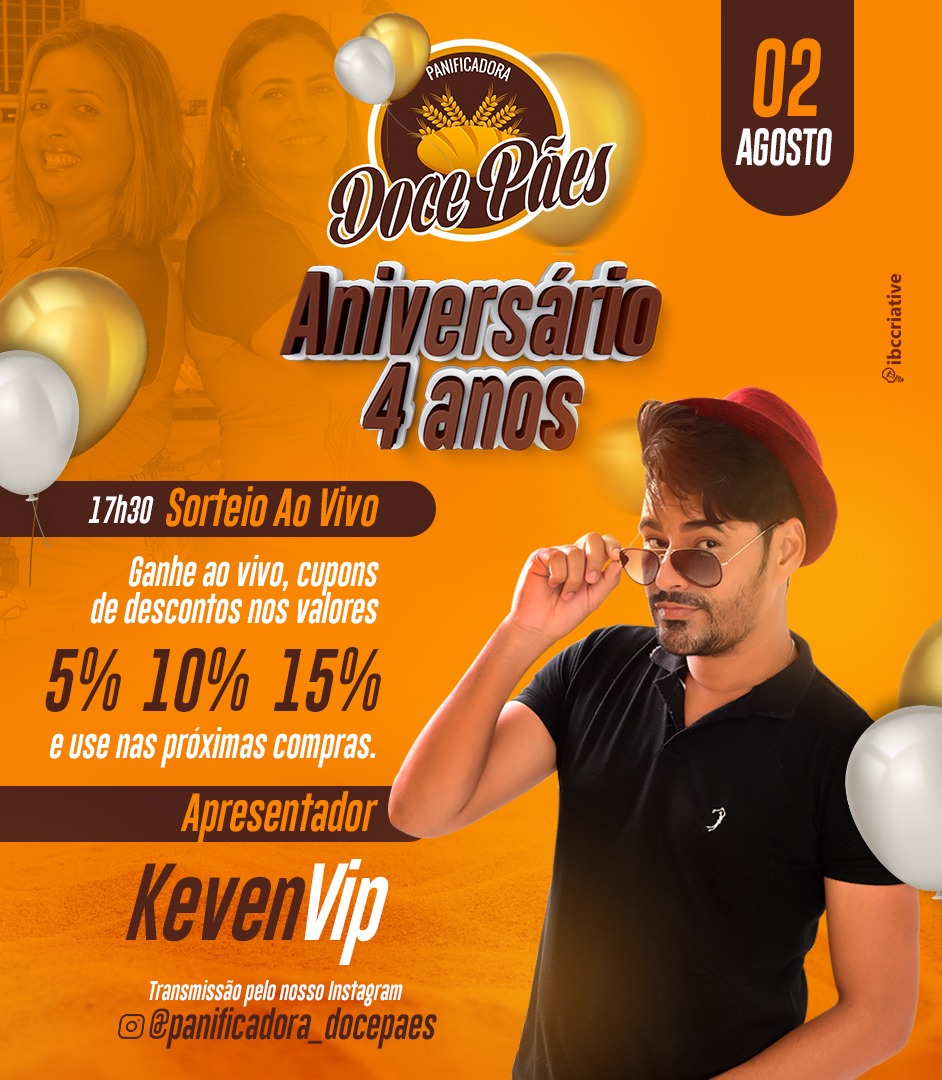 Panificadora Doce Pães de Petrolândia faz aniversário de 4 anos, e quem ganha o presente é você; no dia 2 de agosto, sorteio com apresentação de Keven Vip de cupons para clientes com descontos de 5, 10 e 15%