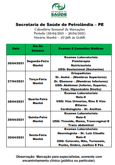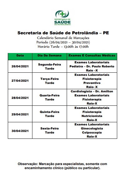 A Secretaria Municipal de Saúde de Petrolândia divulga o calendário semanal para marcação de consultas dessa semana (dia 26/04 à 30/04/2021), manhã e tarde.