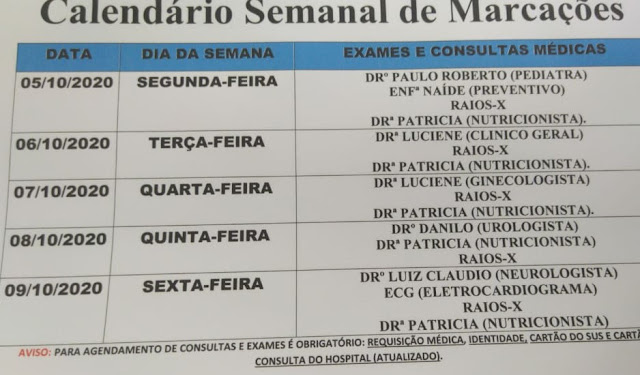A Secretaria Municipal de Saúde de Petrolândia, divulga o calendário de marcações de consultas e exames desta semana.