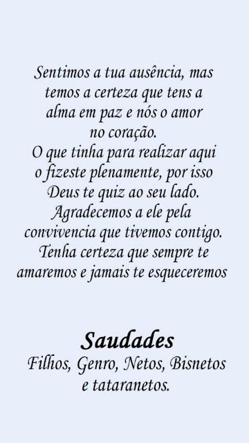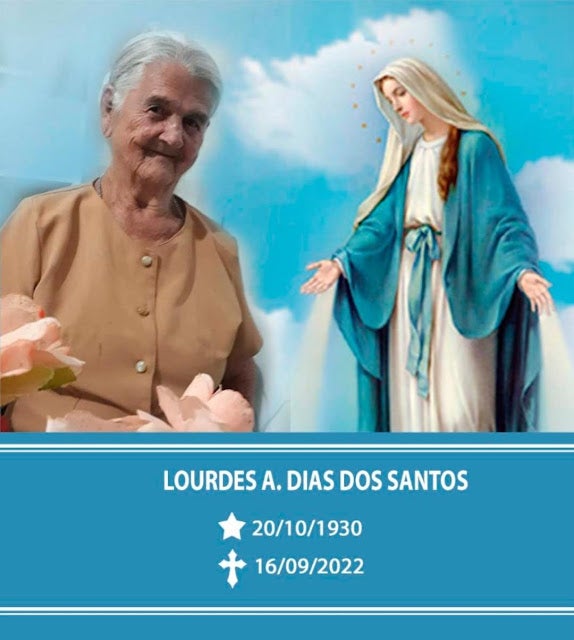 Aproveitamos para agradecer a cada um as mais diversas manifestações de conforto, apoio, carinho e solidariedade recebidas neste momento de imensa saudade e gostaríamos de convidar a todos para participar da celebração da Missa pela passagem do Sétimo Dia de Falecimento da Sra. Lourdes Alves Dias dos Santos.