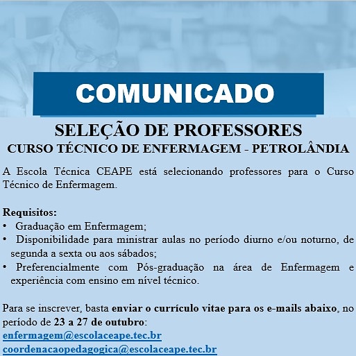 A Escola Técnica CEAPE informa que está selecionando professores para o curso de técnico de enfermagem de acordo com os requisitos citados.