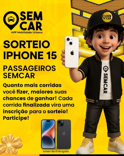 E para celebrar esse marco, o SemCar preparou um presente especial: um iPhone 15 novinho! Quer saber como garantir sua chance? É simples: