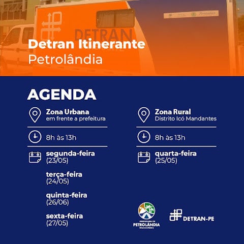 Petrolândia, Sertão de Pernambuco, vai receber o “Detran Itinerante”, com atendimentos para a comunidade entre os dias 23e 27 de maio. O caminhão de atendimento está estacionado na Avenida dos Três Poderes em frente da Prefeitura, das 8h às 13h.