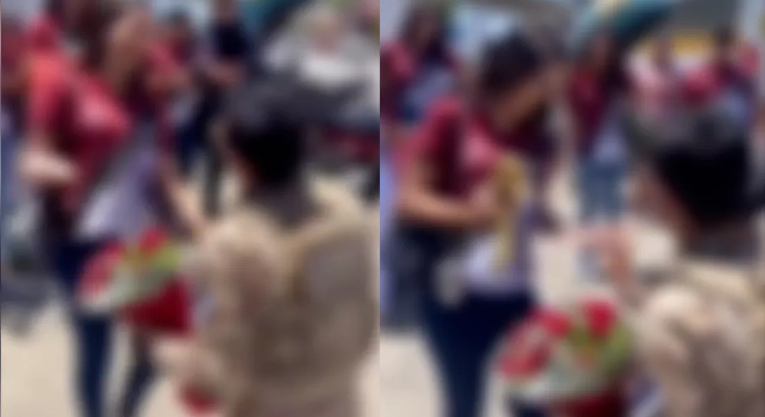 Relatos indicam que a adolescente tem 15 anos e ela aparece no vídeo com uma farda onde se lê “concluintes 2023” do 9º Ano do Ensino Fundamental. Também há informações de que o policial teria chegado ao local de viatura, acompanhado de colegas de farda.