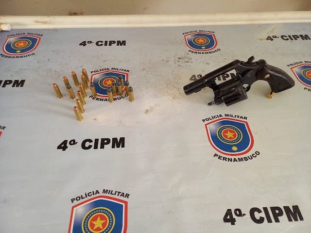 Durante a ação o efetivo militar achou no quintal da parte de trás da residência, 01 arma de fogo, revólver Cal.38, de 06 tiros, além de 20 cartuchos intactos do mesmo calibre em uma sacola plástica.