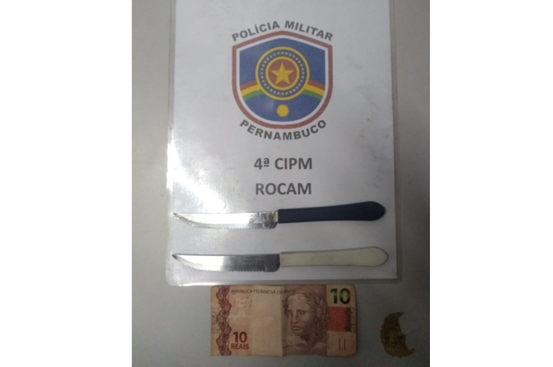 Foram feitas incursões e localizados os autores do delito, cuja vítima os reconheceu. Ao ser procedida a abordagem no indivíduo de 31 anos, foram encontradas 02 (duas) armas brancas (facas), e com outro suspeito 26 anos, foi encontrada a quantia exata de R$ 10,00 (supostamente produto do roubo).