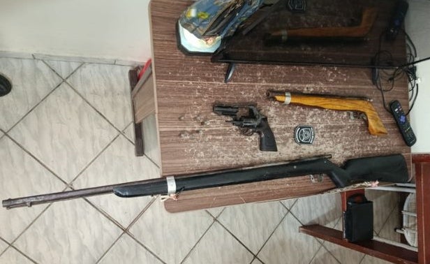 De imediato, as guarnições se deslocaram até o local informado, onde encontraram o suspeito e confirmaram a denúncia. Durante buscas na residência, foram apreendidas três armas de fogo, sendo um revólver calibre .38 com seis munições intactas e duas espingardas artesanais.