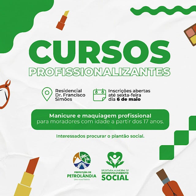A Prefeitura de Petrolândia através da empresa Projesol, informa que estão abertas as inscrições para os cursos de Manicure e Maquiagem profissional.
