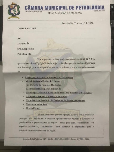 Através do Ofício de n° 051/2022, destinado a Sra. Leopoldina – reitora da IF – Instituto Federal do Sertão, o Vereador/Presidente da Câmara de Petrolândia, Erinaldo Alencar – Dedé de França (MDB) solicitou em reunião com a mesma, que a instituição de ensino traga cursos de pós-graduação ‘Latu Senso’ para o município.